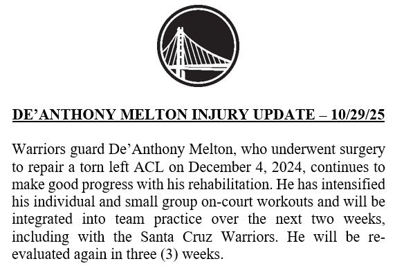 根據(jù)勇士隊(duì)的消息,梅爾頓目前已開啟“個(gè)人訓(xùn)練”和“小團(tuán)體訓(xùn)練”;球隊(duì)計(jì)劃在未來幾周內(nèi),將他逐步納入球隊(duì)合練,且合練將同時(shí)覆蓋NBA主隊(duì)與發(fā)展聯(lián)盟的圣克魯斯勇士隊(duì)——后者的訓(xùn)練頻率高于金州勇士主隊(duì)。